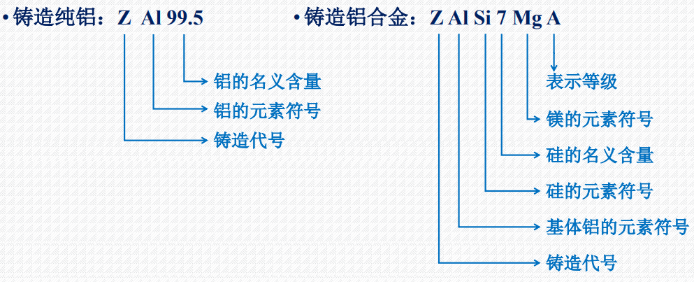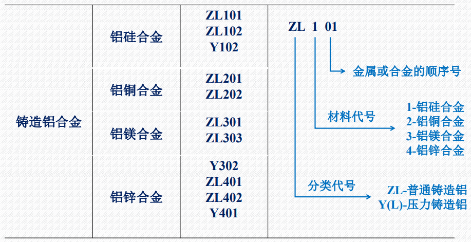 En la actualidad, no existe un estándar unificado para lanzar aleaciones de aluminio a nivel internacional, y cada país (empresa) tiene su propio nombre de aleación y terminología. Según los estándares chinos, los grados de metal no ferrosos fundidos consisten en "Z", el símbolo del elemento del metal base, el símbolo del elemento de aleación principal y un número que indica el contenido nominal del elemento de aleación; Cuando hay más de 2 elementos de aleación, el grado de aleación debe enumerar los símbolos del elemento y sus contenidos nominales que son suficientes para indicar las características principales de la aleación; Los símbolos de los elementos de aleación se organizan en orden descendente de su contenido nominal; Excepto por el contenido nominal del elemento matriz, que no está indicado, el contenido nominal de otros elementos de aleación se indica después del símbolo de ese elemento.
